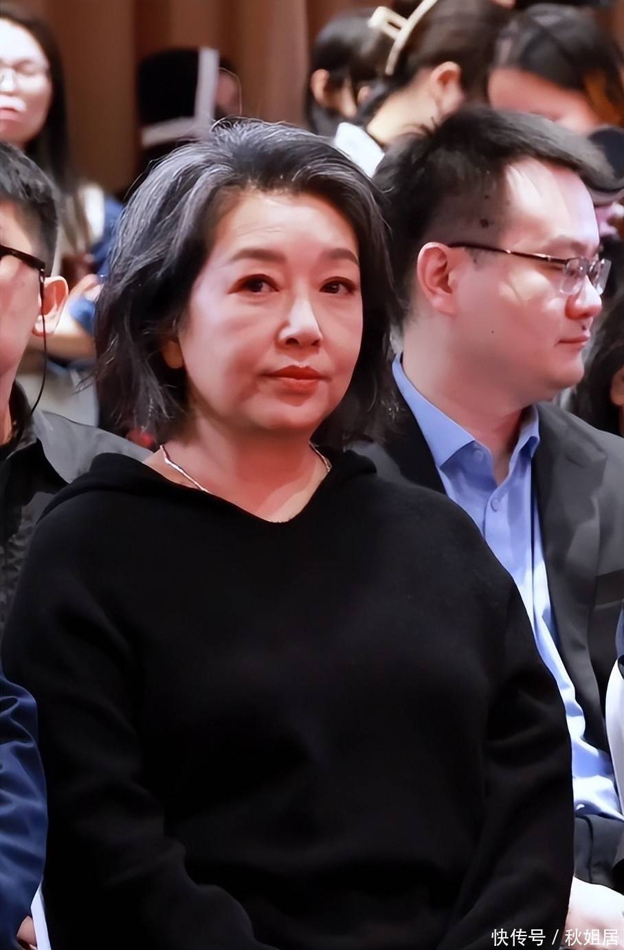 她的穿着极为随性:一件基础款黑色卫衣搭配牛仔裤,没有华服加身,也未施浓妆艳抹,初看如同身边气质出众的普通长辈,却散发着一种难得的生活气息与亲和力。